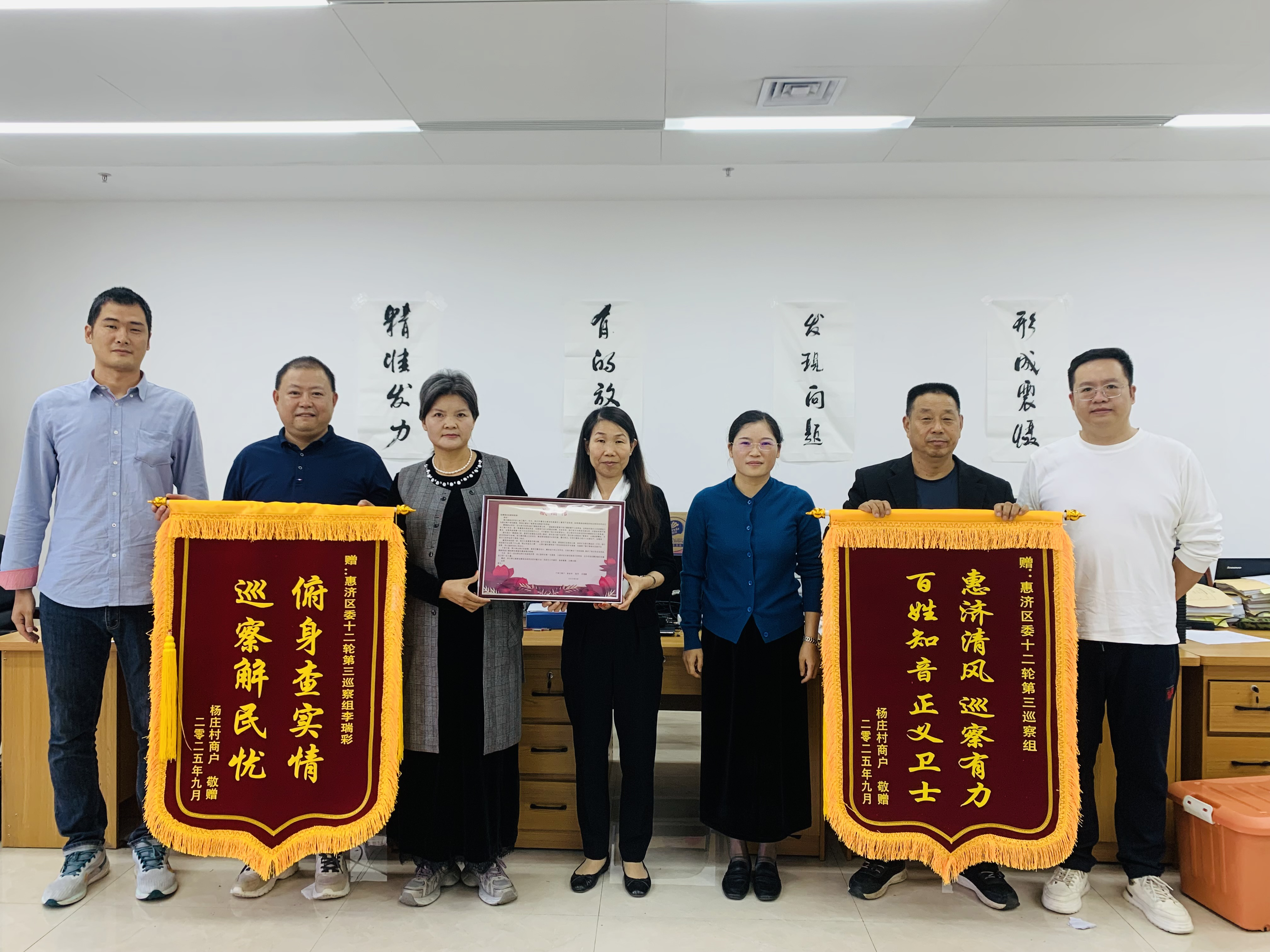 2025年9月29日,一个普通的秋日清晨,惠济区委巡察办的办公室里却因几位特殊“客人”的到来,而显得格外温暖。几位商户代表将写着“惠济清风,巡察有力;百姓知音,正义卫士!”的锦旗,交到巡察干部手中。那一刻,他们所有的艰辛与等待,都化为了理解和信任。