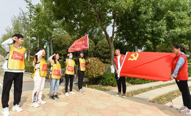 “我志愿加入中国共产党,拥护党的纲领,遵守党的章程,……随时准备为党和人民牺牲一切,永不叛党”。面向党旗,参赛队员们立足本职岗位,心怀敬慕,举起右拳,重温入党誓词。一字一句、铿锵有力。一字一句,发自内心。大家重温入党誓词、更坚定了理想信念。