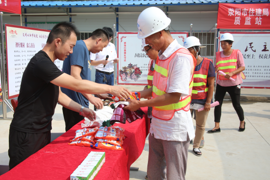 活动现场,质监站工作人员还为农民工兄弟发放了《郑州市文明行为促进条例》等学习材料,赠送了矿泉水、毛巾、洗衣粉、肥皂、清凉油、手套等防暑降温和劳保用品。