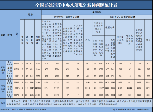 为掌握全国贯彻落实中央八项规定精神情况,中央纪委国家监委在各省区市和新疆生产建设兵团、各中央和国家机关、各中央企业和中央金融企业等建立了落实中央八项规定精神情况月报制度。2020年以来,截至8月31日,全国查处违反中央八项规定精神问题情况如下: